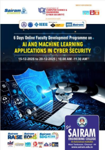 A Virtual Faculty Development Programme (FDP) on “AI and Machine Learning Applications in Cyber Security” was held from 15th to 20th December 2025, featuring expert sessions by leading academicians and industry professionals. The programme covered key topics such as machine learning fundamentals, data preprocessing, supervised and unsupervised learning, anomaly detection, generative AI, and modern tools and frameworks for cyber security. Speakers from NIT Tiruchirappalli, Shiv Nadar University Chennai, NIT Raipur, Fractal Analytics, and ServiceNow shared both theoretical insights and practical perspectives. The FDP successfully enhanced participants’ knowledge of AI-driven cyber security solutions and emerging research trends.
